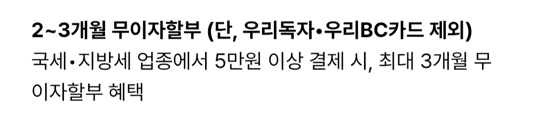 또한, BC카드 중 우리BC카드를 제외하고 나머지 카드는 2~3개월 무이자할부 지원한다고 합니다.