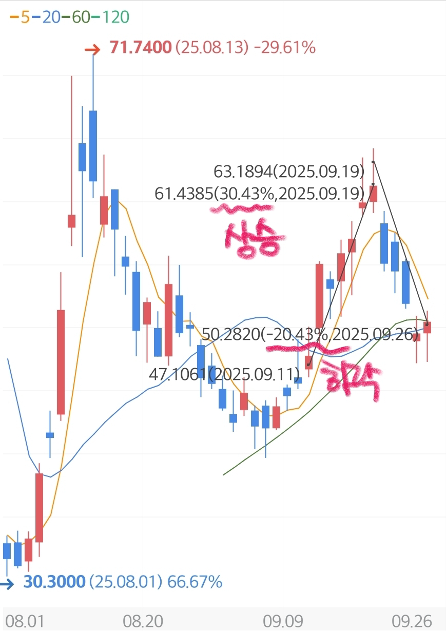 그리고 바로 3개의 장대음봉을 맞고 4번째날 갭하락을 맞으면 상승분의 대부분을 다시 반납했다.