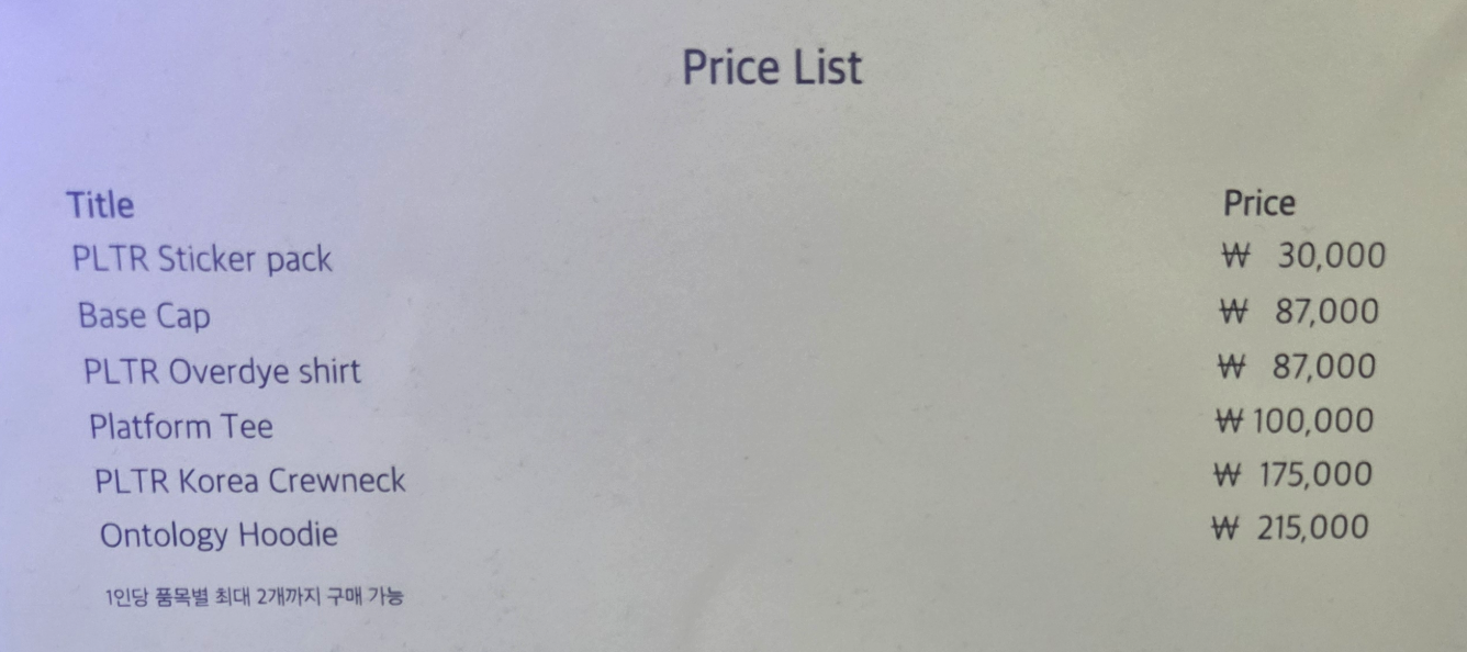 - 15.91불에 900주를 가지고 있었다. 배우자와 자녀 양도를 통해서 이제 내 손을 떠났지만 팔란티어의 평단이 지금 옛날에 스크린샷 해놓은걸 보니 15불이었다. 오늘 내가 굳이 연차까지 쓰고 팔란티어 팝업을 가게 된 이유는 내 자산을 불려준것에 대한 감사이자, 아직도 홀딩하고 있는 보유량의 매매 타이밍을 알고싶어서 였다. 엄청 비싼 굿즈임을 알면서도 찾아간것이다!!!