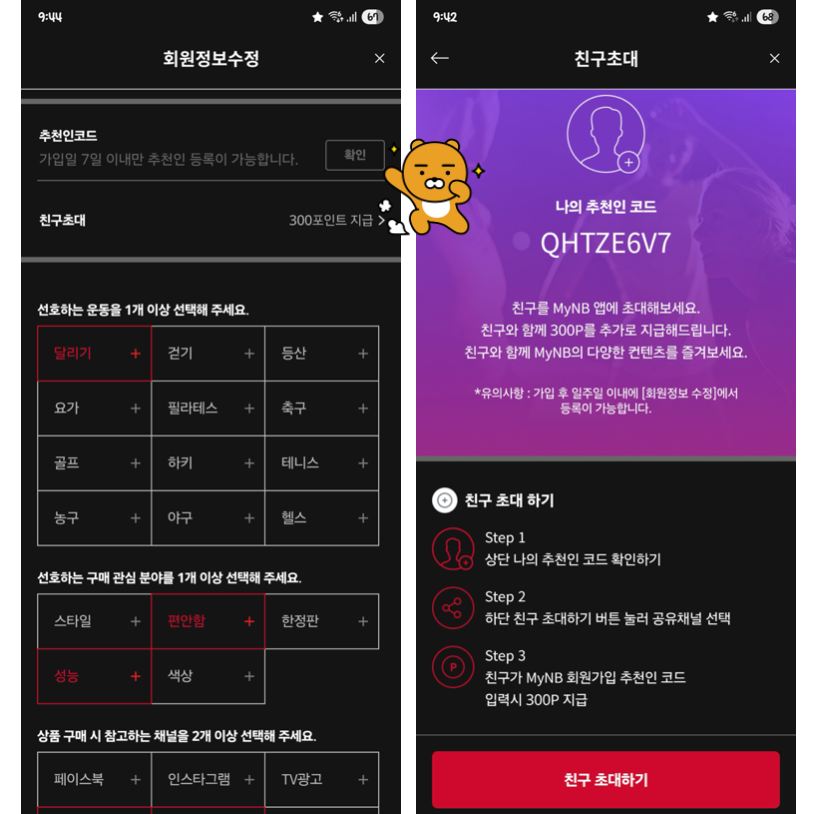 그리고 히든 미션으로 위의 메뉴에 들어가서 추천인 코드를 넣으면 가입 일주일안에 300포인트 주니까 추천인 코드 입력을 권장한다. 나도 받고 사용자 본인도 받는것이다. 안넣으면 본인도 못받는것이니... 나처럼 친구가 없으신분은 내 아이디를 입력하시길 바란다. 이거 복사해서 쓰라고 별도로 타이핑해놓겠다.