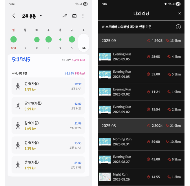 근데 막상 처음에 열심히 뛸때는 은근 이걸 까먹고 안누르고 출발하는 경우도 좀 있다. 그럴때는 살짝 그 포인트가 아깝긴 하지만 돌릴수가 없다. 이 앱을 구매한 다음에 삼성헬스와 구글핏을 설정해 놓으면 별다른 스타트 버튼을 누르지 않아도 폰을 런닝벨트에 넣고 뛴다는 전제하에 데이터가 유실될일이 없다. 그래서 가장 정확한 런닝 데이터를 알고싶으면 특정 앱으로 정확한 기록을 해서 관리하면 된다.