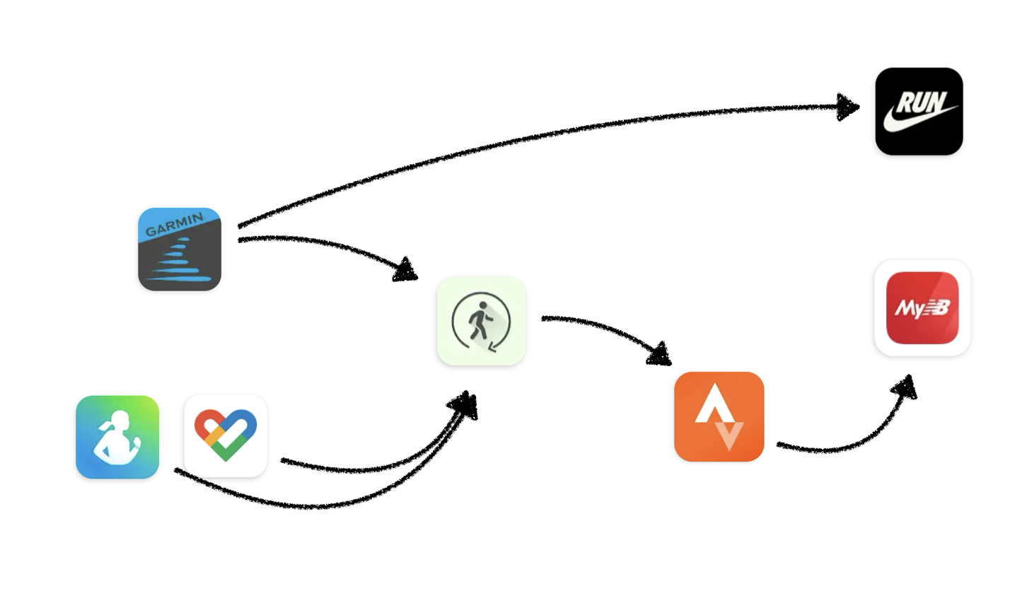 요즘은 워낙 디지털화 되어있어서 어떤 취미를 하는것의 즐거움에는 기록의 즐거움을 빼놓을수 없는것 같다. 대부분의 경우에 기록이란 귀찮은거지만 취미에 있어서는 성장하는 자신의 위차가 즉각적으로 확인되어서 인지 빠질수없는 재미요소는 확실하다. 열심히 달렸는데 기록되지 않고 날라가면 누가 돈을 주는것도 아닌데 뭔가 아쉽다. 이미 알겠지만 런닝 관련되서는 많은 앱이 있다. 나의 경우 Garmin Forrunner 55를 가지고 있어서 정식 기록은 가민 Sports 앱에서 확인하는 편이다. 나머지 Nike run Club, Samsung Health, Google Fitness, Strava를 서브로 기록하고 있는 편이다. 뭐가 엄청 많지만 나름의 각각의 쓰임이 있는 편이다. 내가 가진 시스템을 설명하면 대략 이런식이다.